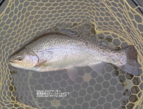 今日はポンドの凍結が無く良かったのですが、天気は曇りで風が無く寒い一日 になりました。 2号池のタナはボトムでしたが、べた底ではなく少し巻き上げたところだったそうです。 2号池ではフックやスナップを伸ばされたり、ルアーを丸呑みされたりで、惜しくもネットイン までいかないケースが見られました。 ヒットカラーは茶系でした。